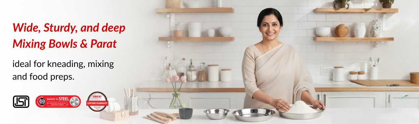 Available in various sizes, from small basins to large parats, VINOD Steel offers options to suit all your cooking needs, whether it’s for small tasks or bulk food preparation.