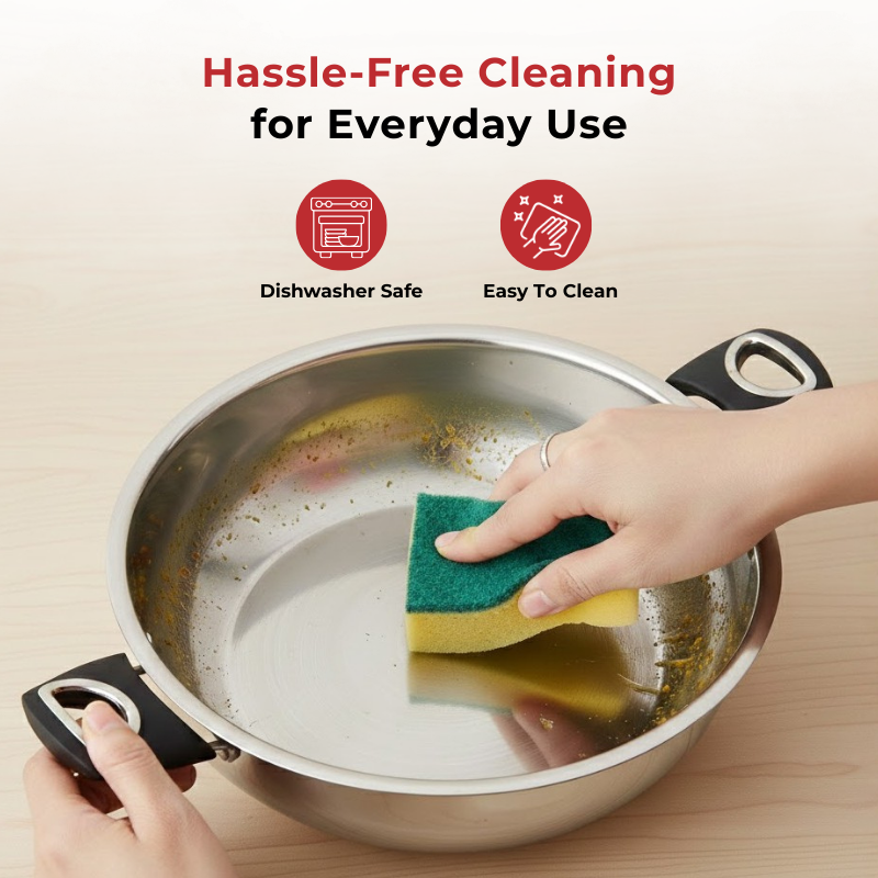 Elevate your cooking experience with the DONIV Sorrento Kadhai. Crafted from high-quality stainless steel, this kadhai features a sleek, mirror finish that not only looks stunning but also ensures durability and longevity. The unique sandwich bottom design allows for even heat distribution, making it perfect for sautéing and frying to simmering delicious curries.