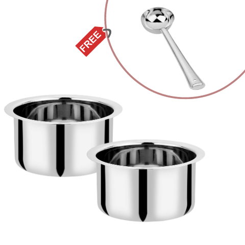Vinod Stainless Steel Induction Friendly Flat Bottom Tope Without Lid – Combo Set – 5.5 Ltr & 6.7 ltr – No 17 & 18 with Free Ladle