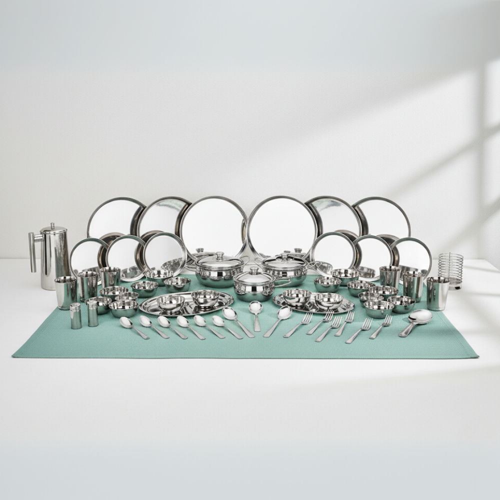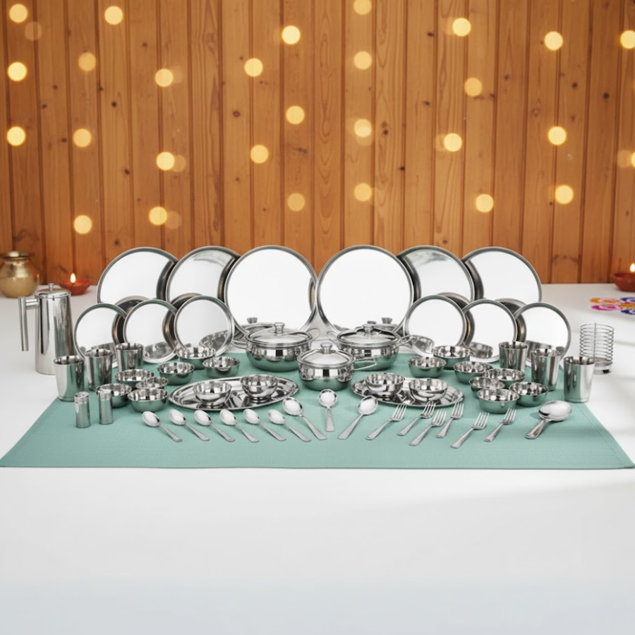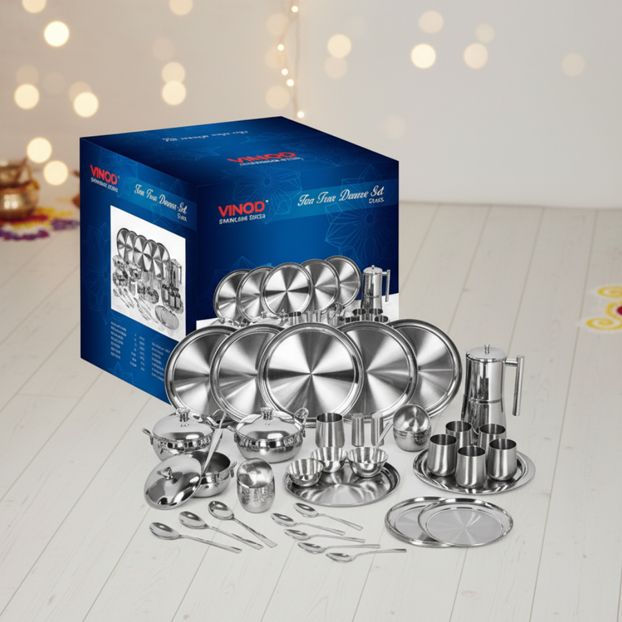 Whether you’re a couple, a small family, or someone who loves hosting large gatherings, VINOD Steel offers dinner sets in various sizes to suit your needs. From compact 18-piece sets to extensive 85-piece collections, each set is thoughtfully designed to provide the right balance of functionality and style.