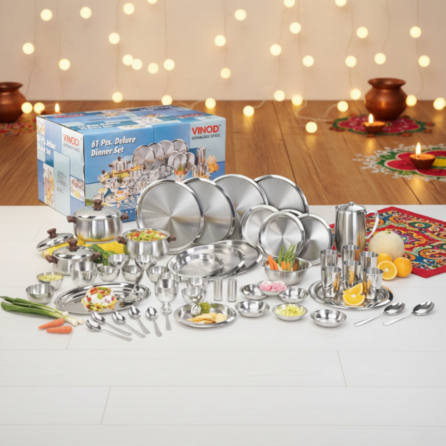 VINOD Stainless Steel 61 Pieces Two-Tone Deluxe Dinner Set – A deluxe option perfect for those who entertain frequently. The 61-piece set comes with an assortment of dinner plates, side plates, bowls, and serving dishes to ensure a complete dining experience with a touch of luxury.