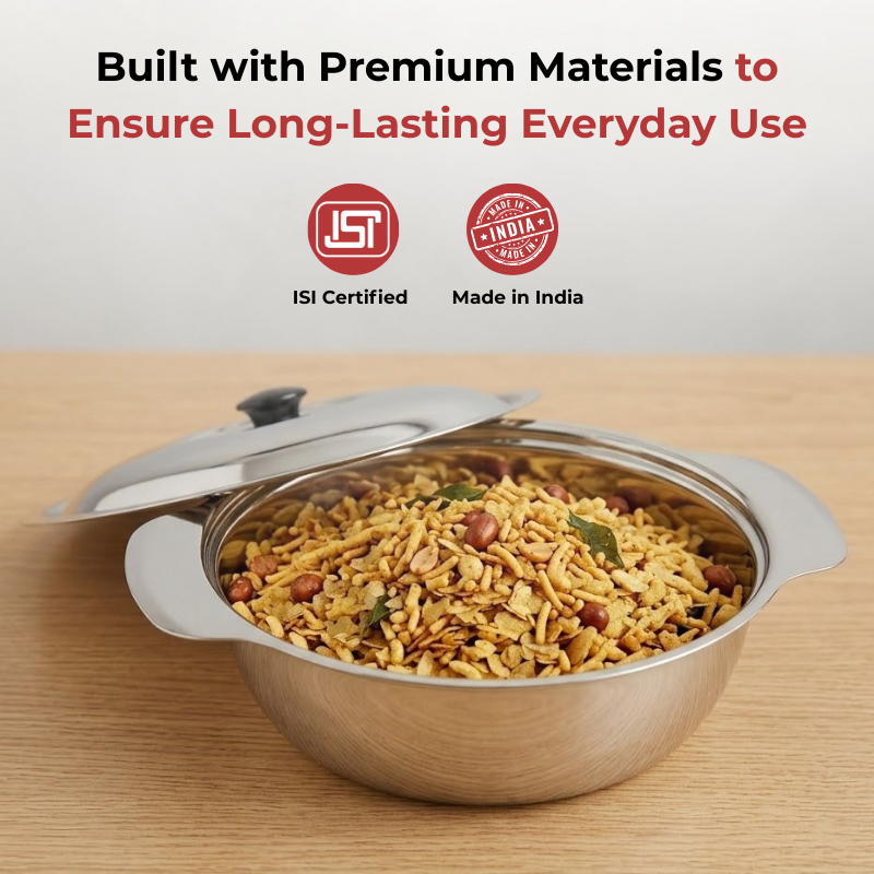 The Royal Veg Serving Dish With Cover, 350 ml is designed for neatly serving smaller portions so meals feel more organised and presentable. This ISI certified stainless steel serving dish features a single open compartment with a matching lid that helps keep food covered until serving time. Made from quality stainless steel with a smooth, shiny finish, this serving dish works well for vegetables, dals, curries, or side dishes while adding a clean, polished look to the dining table.
