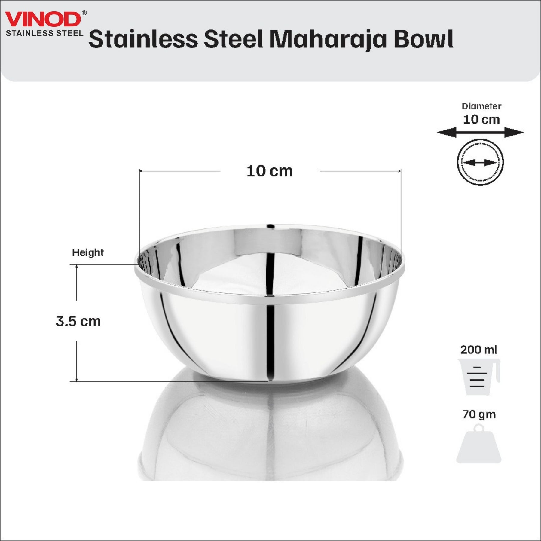 • पैक सामग्री: 6 पीस विनोद स्टेनलेस स्टील महाराजा बाउल, प्रत्येक वाटी की क्षमता 200 मिली, वाटी का व्यास - 10 सेमी, ऊंचाई - 4