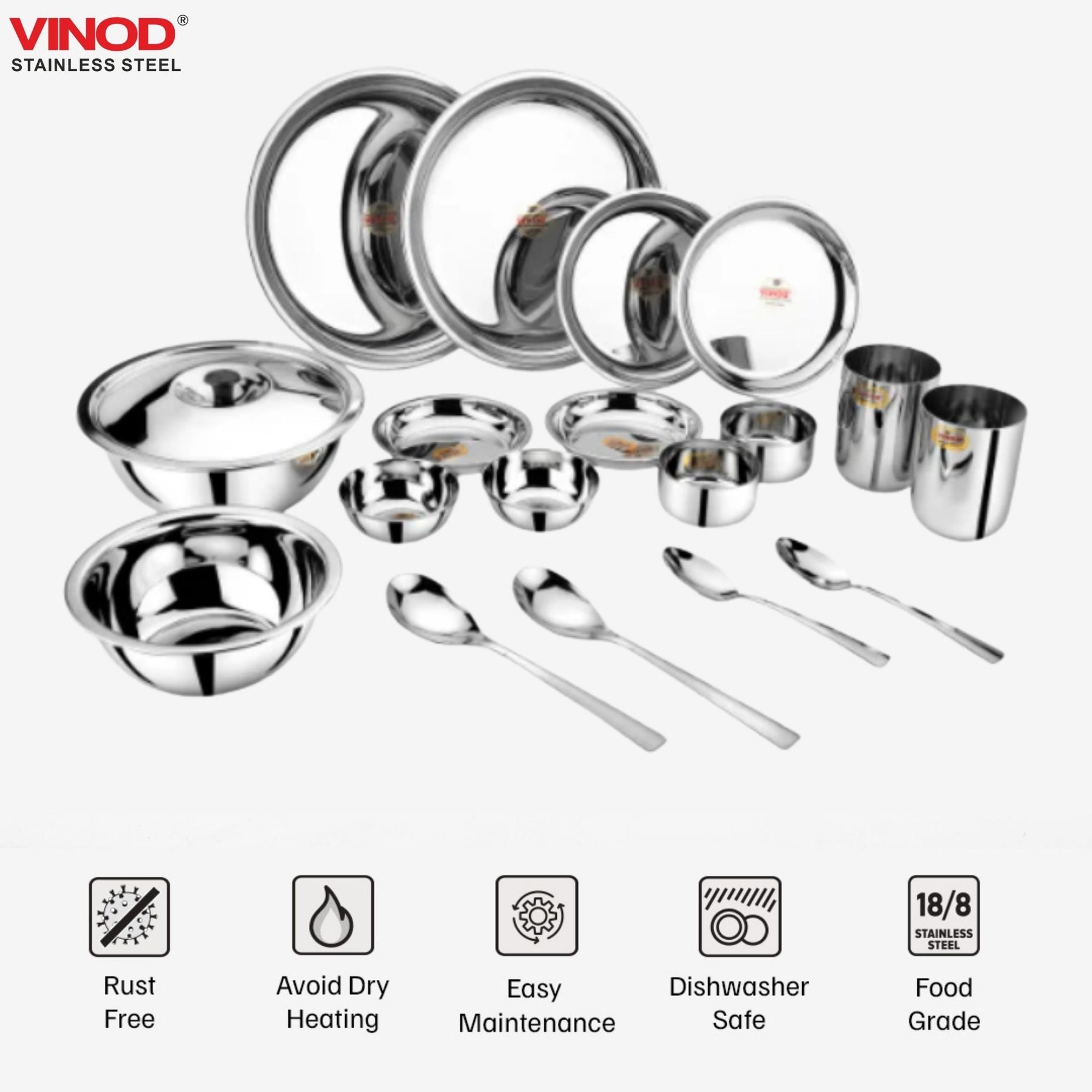 इस विनोद स्टेनलेस स्टील के 18 पीस क्लासी डाइनिंग सेट के साथ स्टाइल से खाना खाएँ। यह बेहतरीन क्वालिटी के स्टेनलेस स्टील से बना है जो न सिर्फ़ इसे एक खूबसूरत फ़िनिश देता है, बल्कि इसे संभालना भी आसान बनाता है।