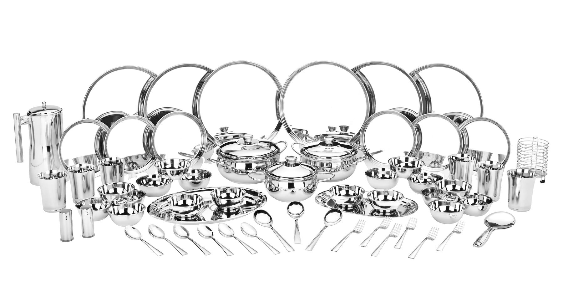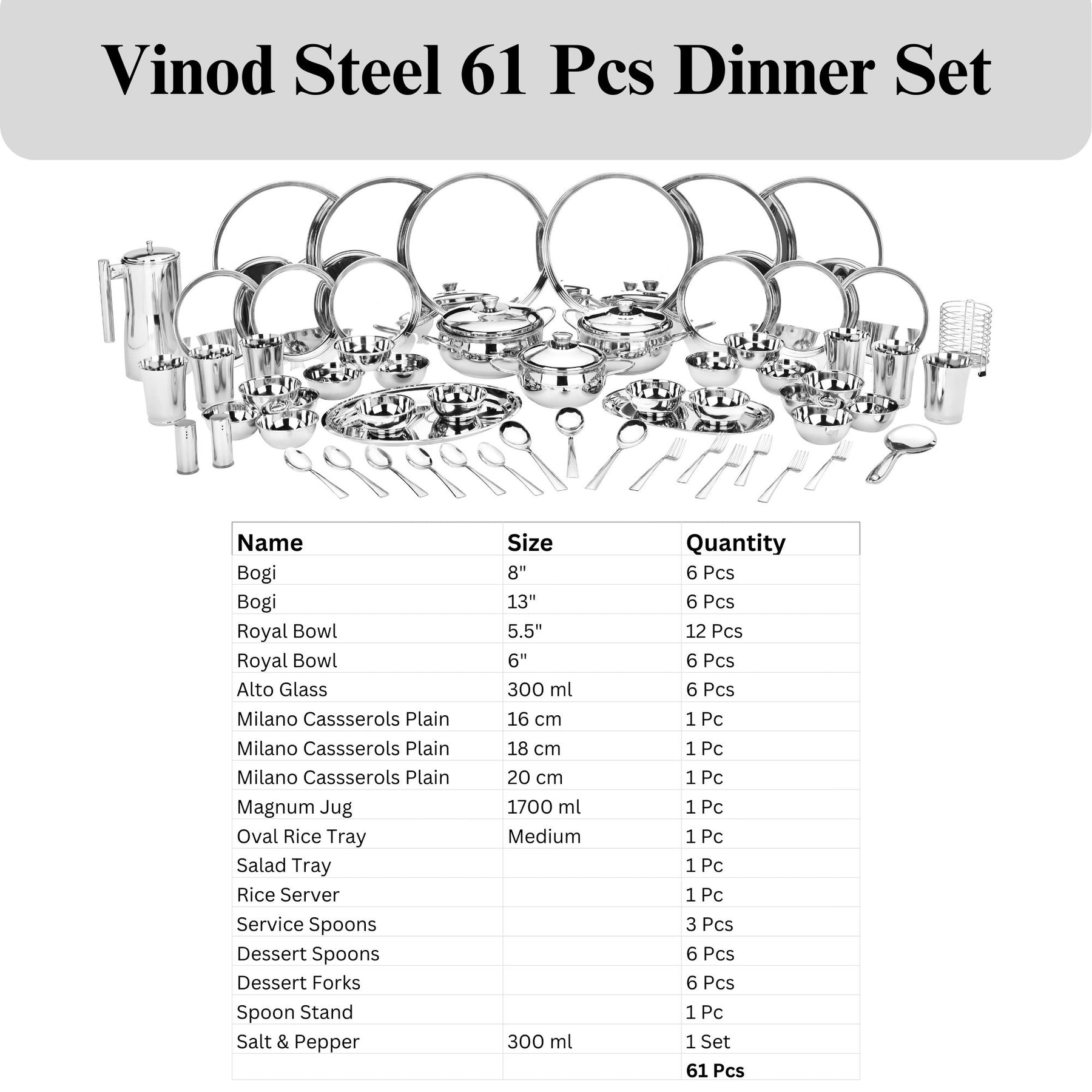 61 पीस डिनर सेट में 12 डिनर प्लेट, 18 बाउल, 3 कैसरोल, 1 जग, 2 ट्रे, 6 ग्लास, 1 राइस सर्वर स्पून, 3 सर्विंग स्पून, 6 डेजर्ट स्पून, 6 डेजर्ट फोर्क, स्पून स्टैंड और नमक-मिर्च का 1 सेट शामिल है। इस पूरे डिनर सेट में एक पूर्ण भोजन के लिए आवश्यक सभी चीजें शामिल हैं, जो इसे पारिवारिक समारोहों, विशेष अवसरों या दैनिक उपयोग के लिए एकदम सही बनाता है। उच्च-गुणवत्ता वाले, फ़ूड-ग्रेड स्टेनलेस स्टील से निर्मित, प्रत्येक सेट में एक शानदार मिरर फ़िनिश है जो सुंदर और टिकाऊ दोनों है। प्रीमियम मटीरियल जंग-रोधी, डेंट-प्रतिरोधी और संक्षारक-रहित है।