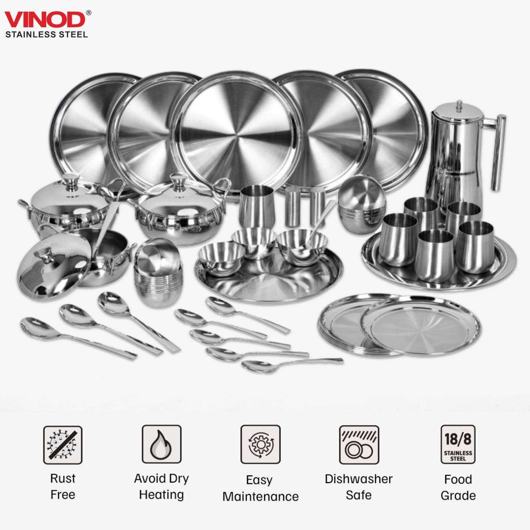 अपनी गुणवत्ता और पीढ़ियों से चले आ रहे भरोसे के साथ, विनोद भारत के हर रसोईघर और भोजनालय का एक अभिन्न अंग बन गया है। हमारा दृढ़ संकल्प हमें अपने ग्राहकों को बेजोड़ उच्च गुणवत्ता वाले स्टेनलेस स्टील के किचनवेयर , टेबलवेयर , टिफिन और सर्ववेयर परोसने के लिए प्रेरित करता है, जिसमें डिनर सेट से लेकर क्लासिक मसाला डब्बा तक, स्टेनलेस स्टील के बर्तनों की एक विस्तृत श्रृंखला शामिल है।