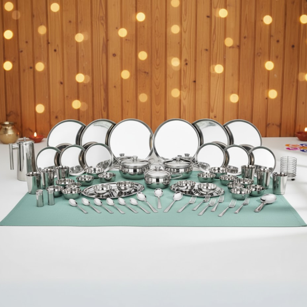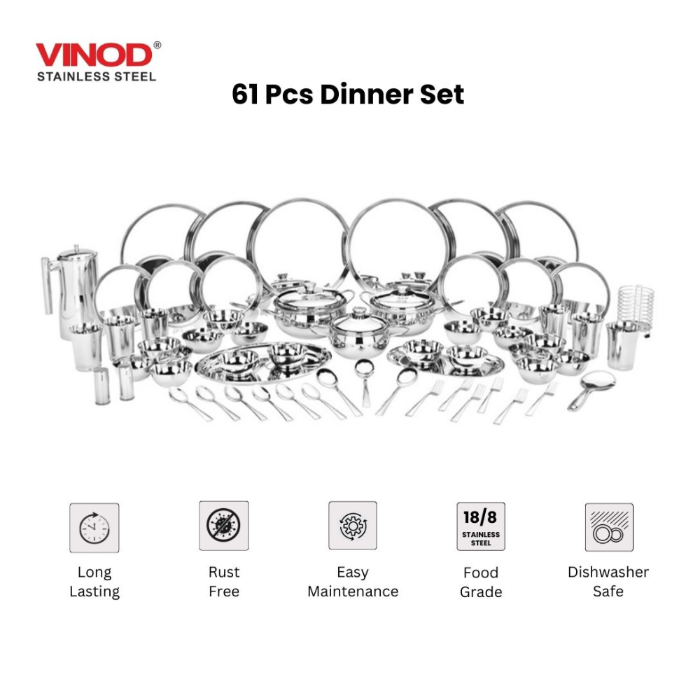 61 पीस डिनर सेट में 12 डिनर प्लेट, 18 बाउल, 3 कैसरोल, 1 जग, 2 ट्रे, 6 ग्लास, 1 राइस सर्वर स्पून, 3 सर्विंग स्पून, 6 डेजर्ट स्पून, 6 डेजर्ट फोर्क, स्पून स्टैंड और नमक-मिर्च का 1 सेट शामिल है। इस पूरे डिनर सेट में एक पूर्ण भोजन के लिए आवश्यक सभी चीजें शामिल हैं, जो इसे पारिवारिक समारोहों, विशेष अवसरों या दैनिक उपयोग के लिए एकदम सही बनाता है। उच्च-गुणवत्ता वाले, फ़ूड-ग्रेड स्टेनलेस स्टील से निर्मित, प्रत्येक सेट में एक शानदार मिरर फ़िनिश है जो सुंदर और टिकाऊ दोनों है। प्रीमियम मटीरियल जंग-रोधी, डेंट-प्रतिरोधी और संक्षारक-रहित है।