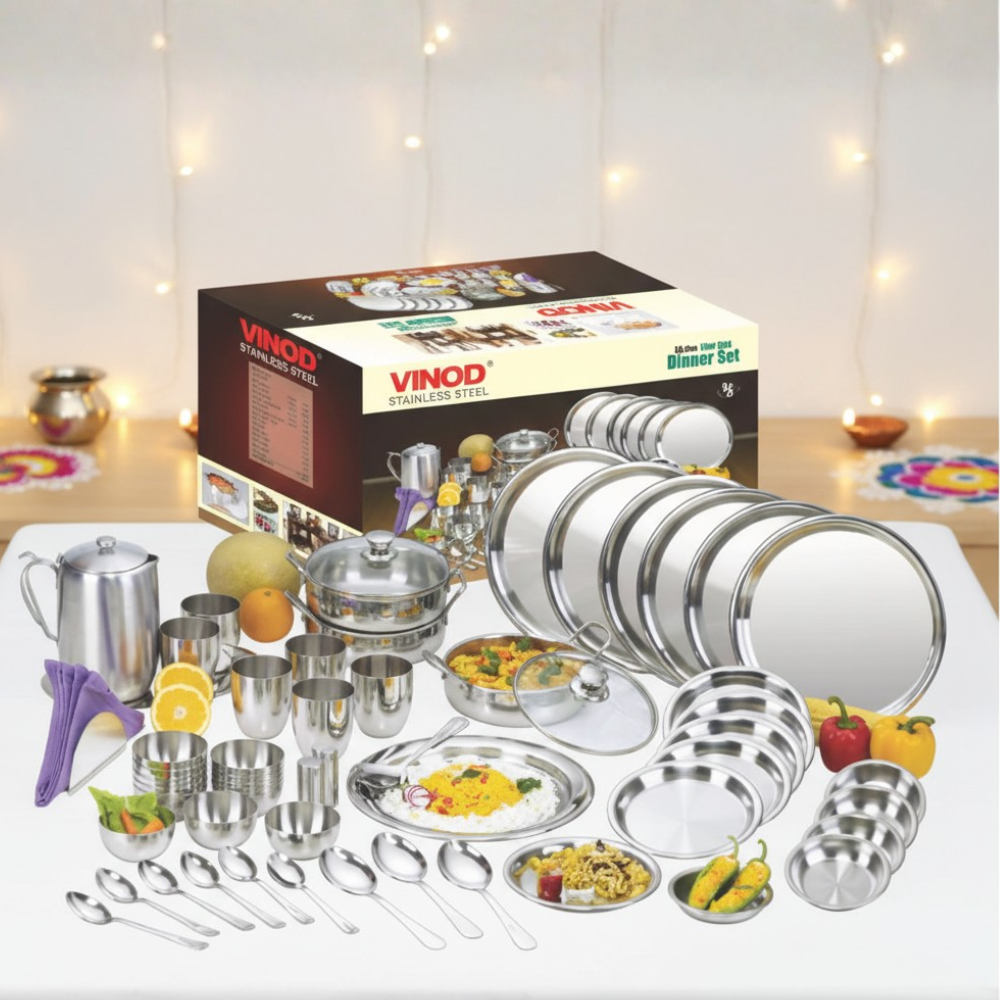 इस विनोद स्टेनलेस स्टील के 55 पीस टू टोन डिनर सेट के साथ स्टाइल से भोजन करें। यह एक क्लासी डाइनिंग सेट है। यह बेहतरीन क्वालिटी के स्टेनलेस स्टील से बना है जो न केवल इसे एक खूबसूरत फिनिश देता है, बल्कि इसे संभालना भी आसान बनाता है।