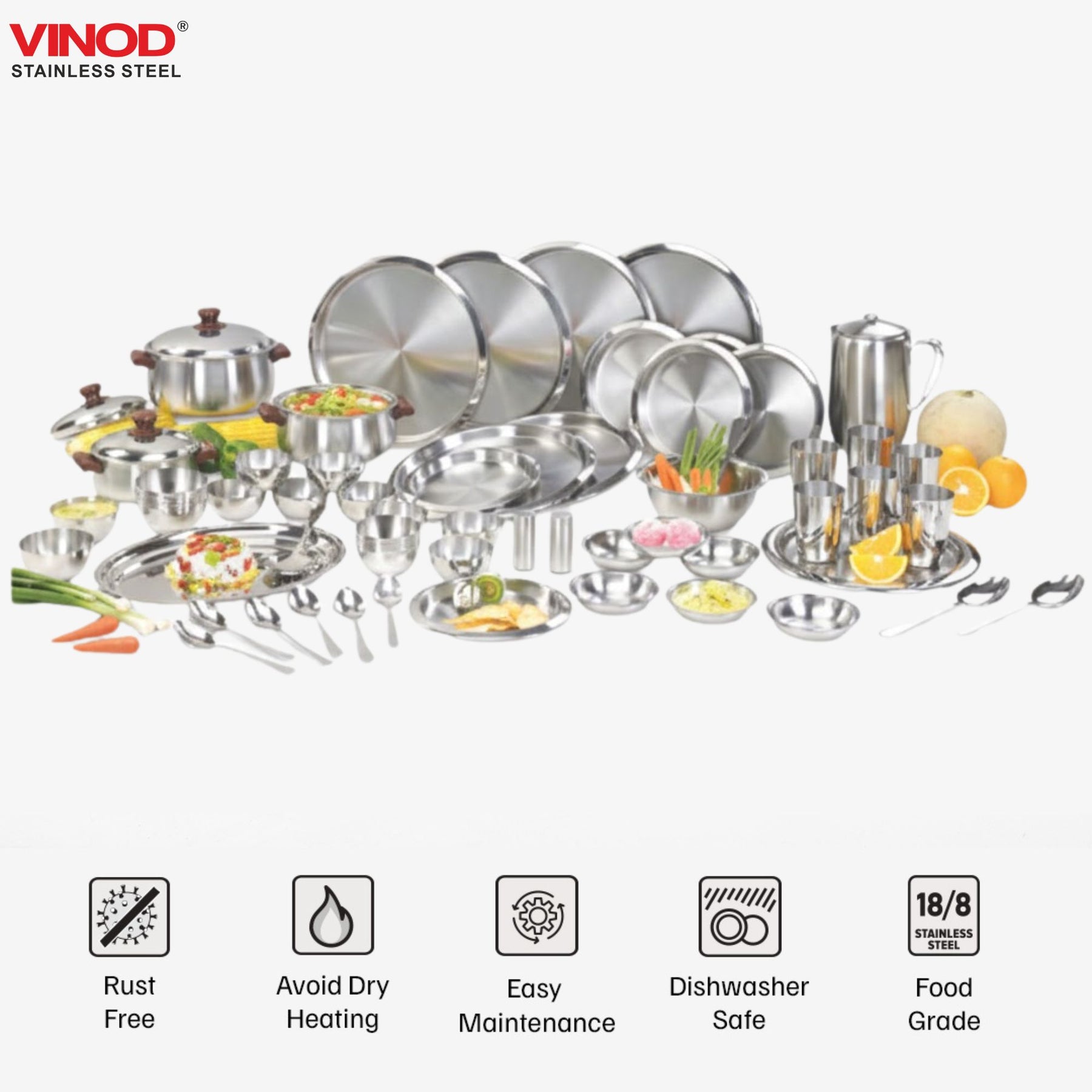 अपनी गुणवत्ता और पीढ़ियों से चले आ रहे भरोसे के साथ, विनोद भारत के हर रसोईघर और भोजनालय का एक अभिन्न अंग बन गया है। हमारा दृढ़ संकल्प हमें अपने ग्राहकों को बेजोड़ उच्च गुणवत्ता वाले स्टेनलेस स्टील के किचनवेयर , टेबलवेयर , टिफिन और सर्ववेयर परोसने के लिए प्रेरित करता है, जिसमें डिनर सेट से लेकर क्लासिक मसाला डब्बा तक, स्टेनलेस स्टील के बर्तनों की एक विस्तृत श्रृंखला शामिल है।