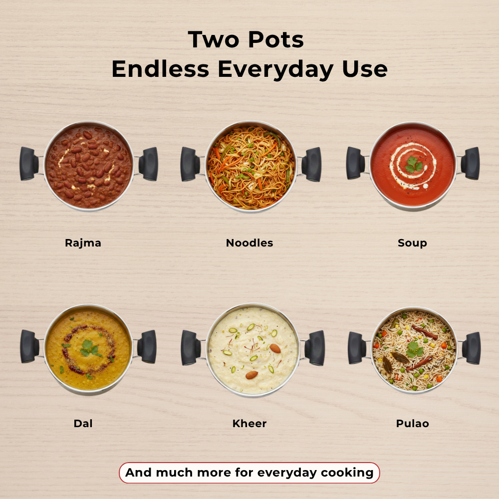 डोनिव का 2 पीस स्टेनलेस स्टील कुकवेयर सेट आपके किचन के लिए एक बेहतरीन कॉम्बो, उच्च-गुणवत्ता और सुंदर अतिरिक्त है। इसका अनोखा डिज़ाइन और अनूठी विशेषताएँ खाना बनाना आसान और सुविधाजनक बनाती हैं। इंडक्शन फ्रेंडली, साफ़ करने में आसान और गर्मी प्रतिरोधी। उपहार देने और देने के लिए बेहतरीन।