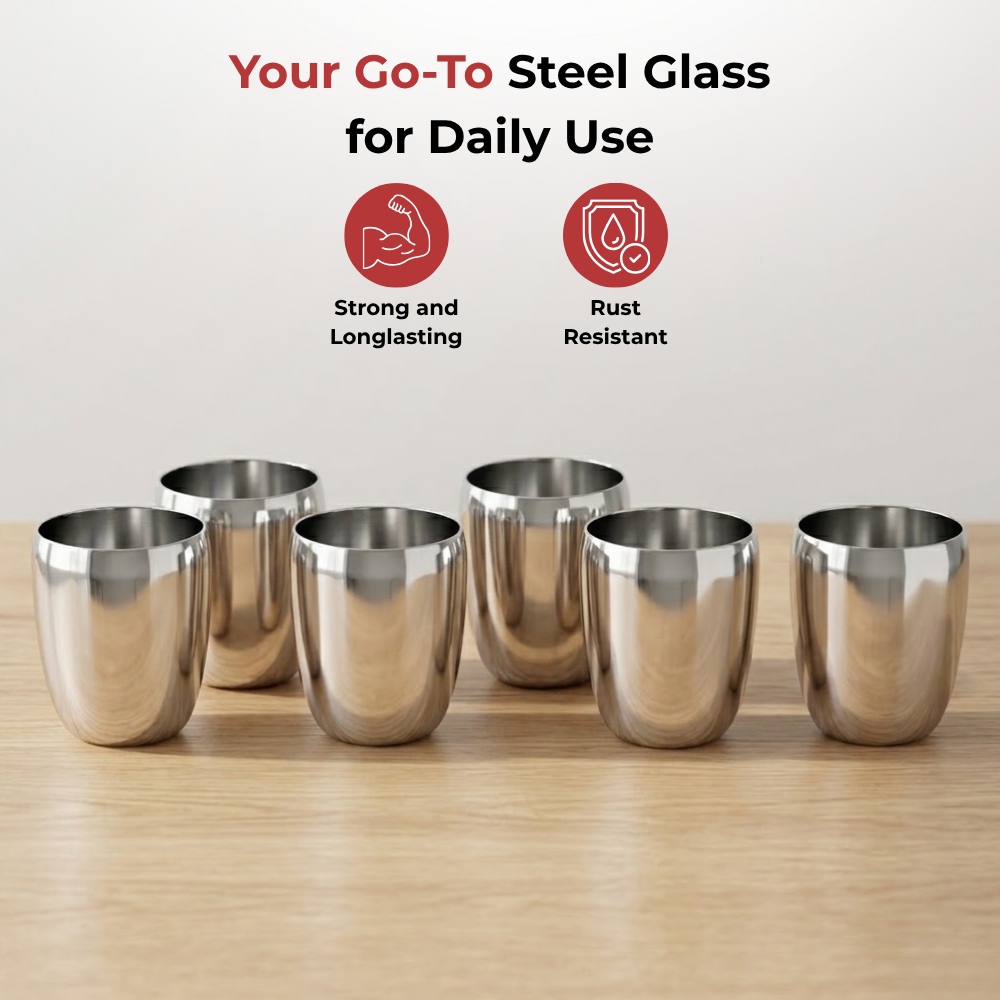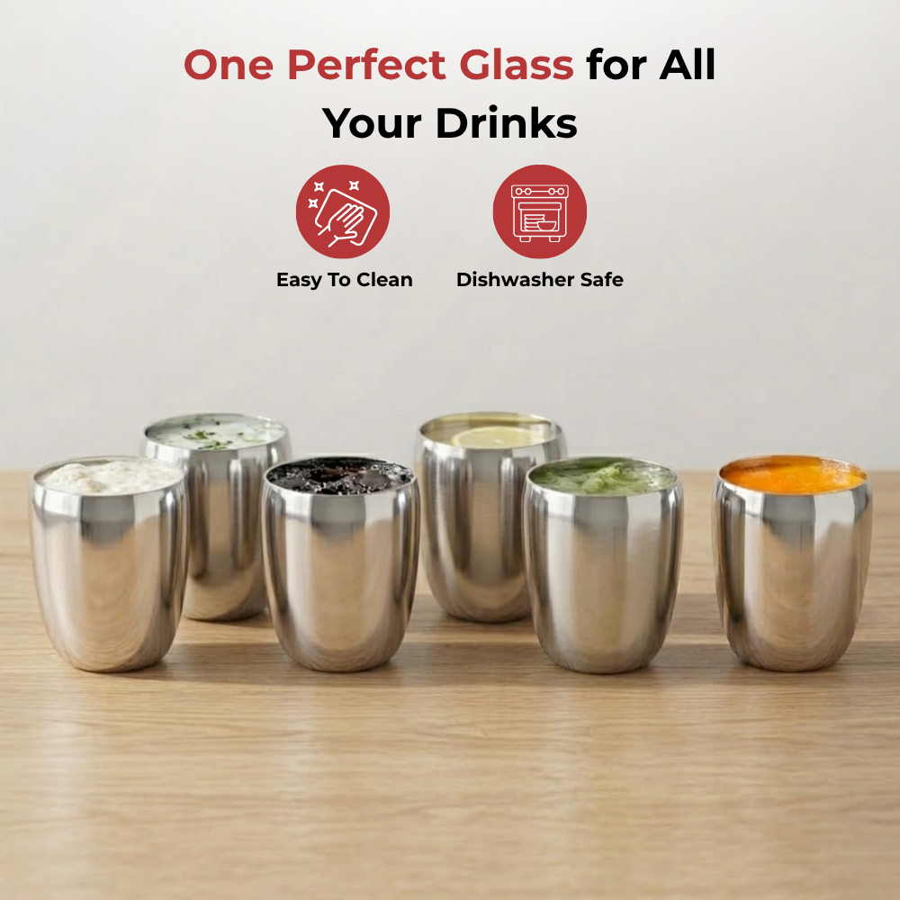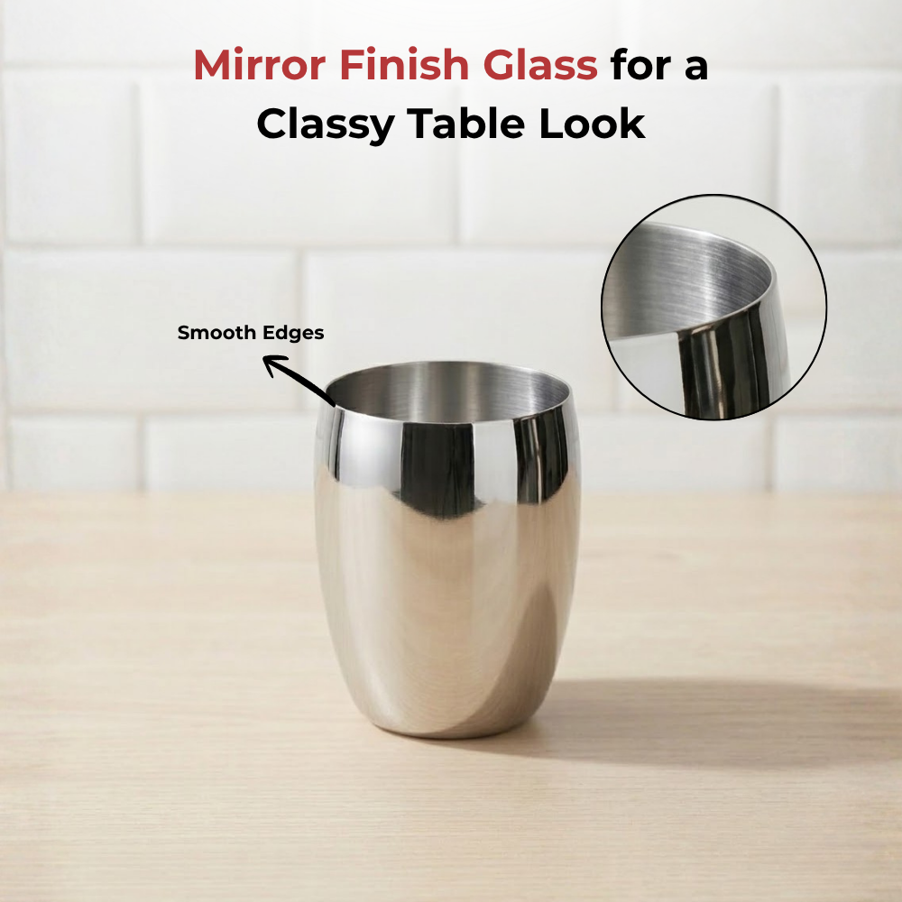 उच्चतम गुणवत्ता वाले स्टेनलेस स्टील से बना, विनोद का स्टेनलेस स्टील मैंगो ग्लास डिशवॉशर सुरक्षित, साफ करने में आसान और बेहद टिकाऊ है। 6 ग्लासों का एक खूबसूरत सेट, यह चमकदार मिरर फ़िनिश के साथ आता है।