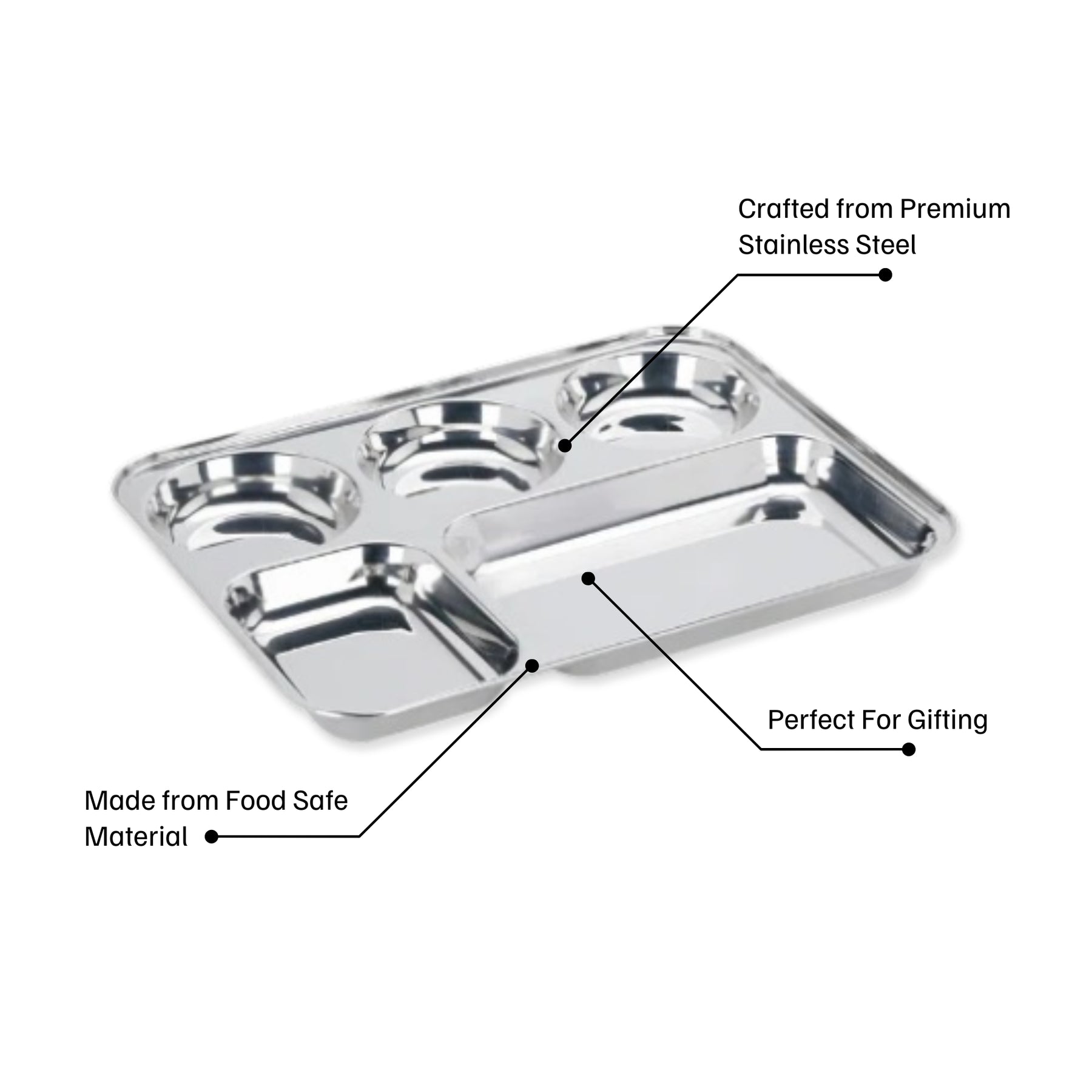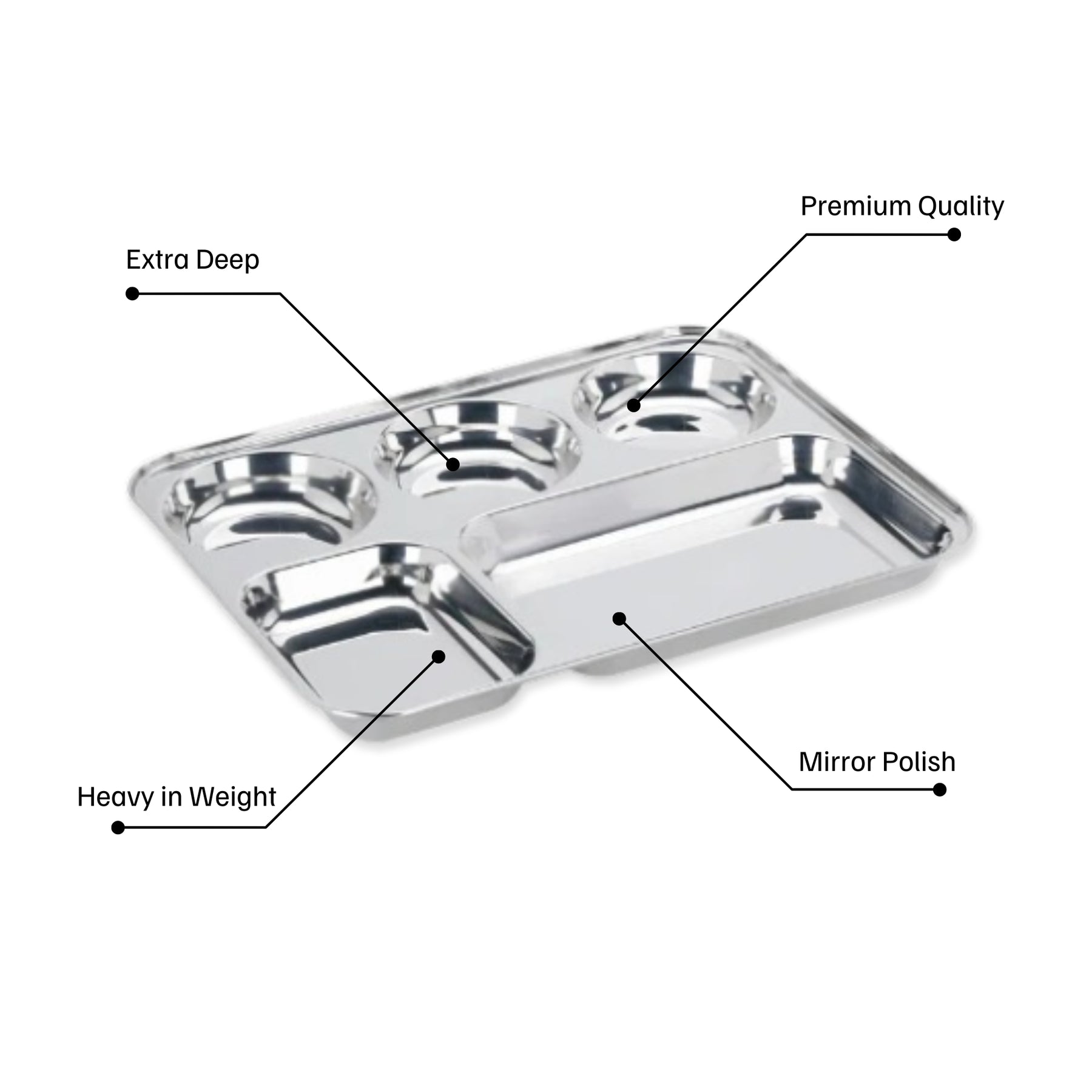 यह स्टेनलेस स्टील मेस ट्रे 5 कम्पार्टमेंट्स के साथ आती है। सभी कम्पार्टमेंट्स अलग-अलग साइज़ के हैं जिनमें अलग-अलग तरह के खाने जैसे चपाती/सलाद/अचार या मिठाई रखी जा सकती है। घर पर पार्टी के लिए यह एकदम सही है। सभी व्यंजन एक साथ एक प्लेट में परोसे जा सकते हैं। इसका इस्तेमाल रेस्टोरेंट में थाली के लिए, मंदिरों/गुरुद्वारों और अस्पतालों जैसे धर्मार्थ कार्यों के लिए और अन्य जगहों पर ज़्यादा किया जाता है जहाँ चार अलग-अलग कटोरों का इस्तेमाल किए बिना एक ही प्लेट में अलग-अलग मात्रा में थोड़ा-थोड़ा खाना परोसा जा सकता है। यह फ़ूड-ग्रेड स्टेनलेस स्टील से बना है और इसकी रेंज बहुत किफ़ायती है। यह टूटने वाला नहीं है, टिकाऊ, मज़बूत, जंगरोधी और लंबे समय तक चलने वाला है।