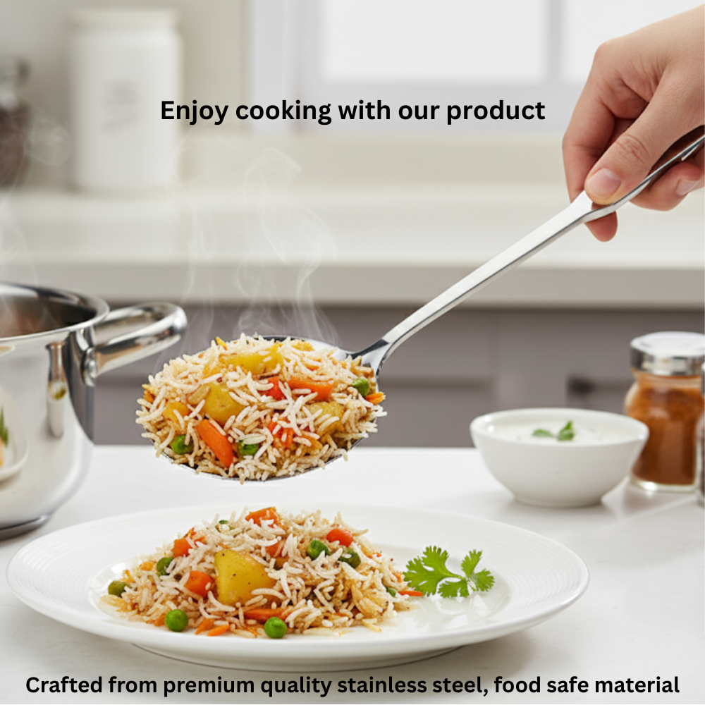 - बहुउद्देश्यीय : स्टील के चम्मच का उपयोग ब्लांच करने, उबालने, स्किमिंग करने, परोसने या तलने के लिए किया जा सकता है