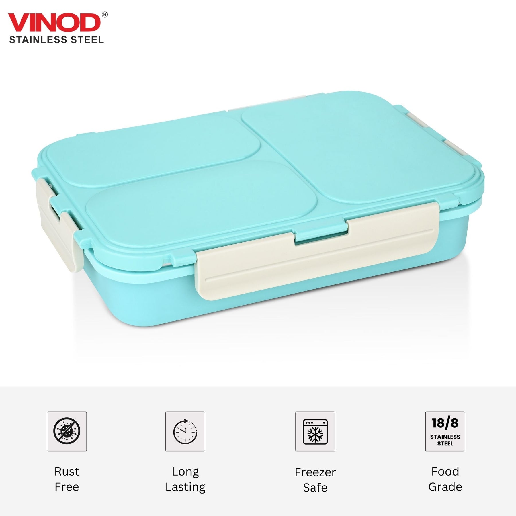 विनोद स्टेनलेस स्टील 3 कम्पार्टमेंट लीक-प्रूफ लंच बॉक्स वैक्यूम सीलबंद टिफिन बॉक्स ऑफिस, बच्चों और वयस्कों के लिए फ्रीजर सेफ बेंटो बॉक्स एयरटाइट कंटेनर, सेफ्टी लॉक के साथ इंसुलेटेड, नीला