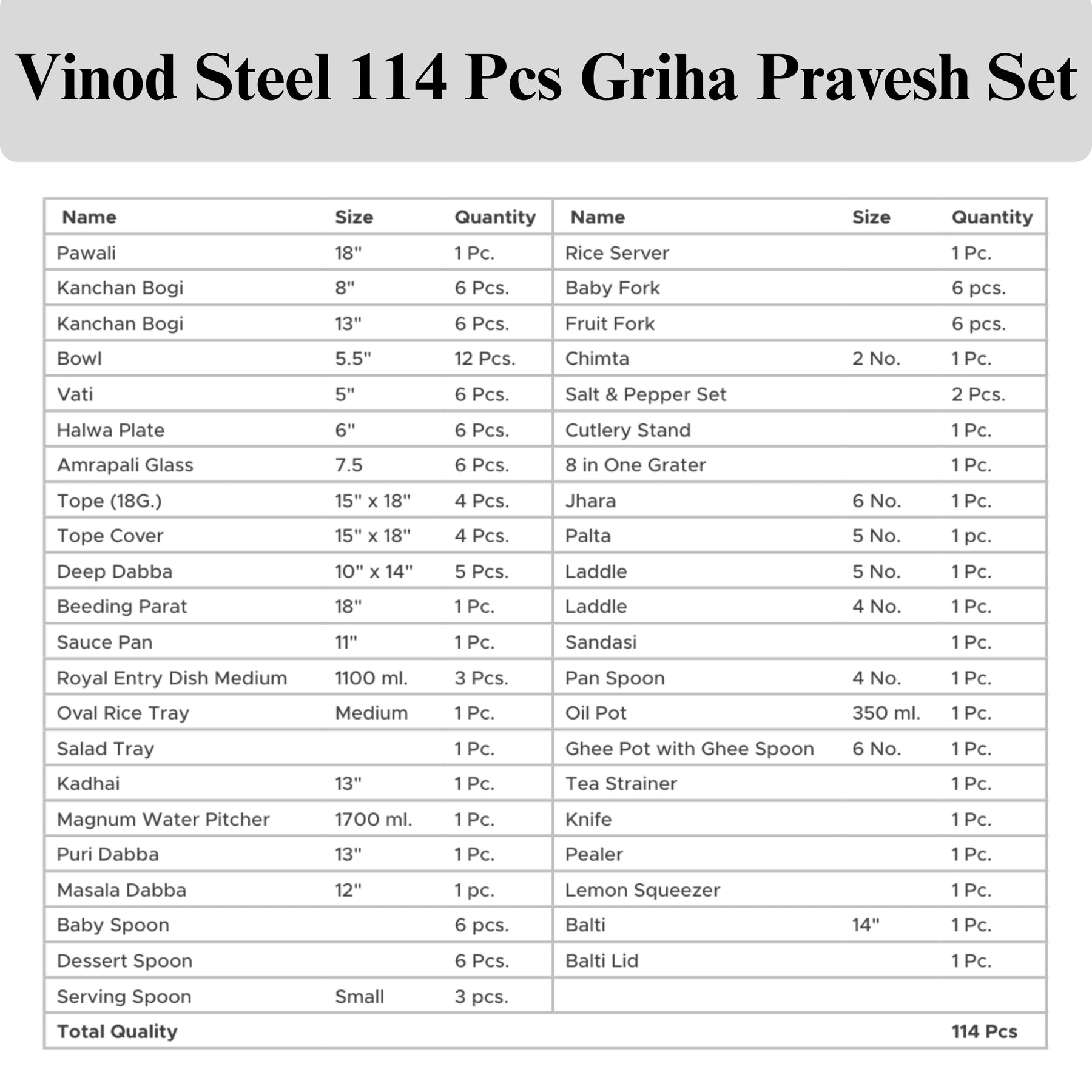 Vinod Stainless Steel 114 Pcs Griha Pravesh Set + 1 Complimentary Pavali