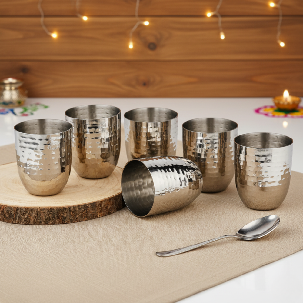 विनोद स्टेनलेस स्टील प्रीमियम ग्लास (हैमरेड) - एक बॉक्स में छह ग्लास (300 मिली)