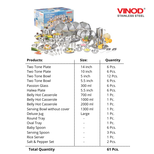Dine with style with this Vinod Stainless Steel 61 piece Two Tone deluxe dinner set is classy dining set. It is crafted from fine quality stainless steel that not only gives it a nice finish but also makes it easy to maintain