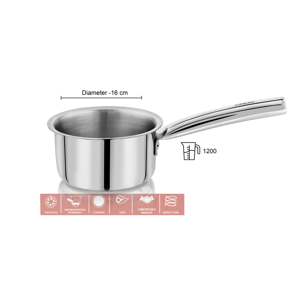 Vinod – Claro Heavy Gauge Stainless Steel Sauce Pan (Plain), 1.5 mm – Capacity 1200 ml