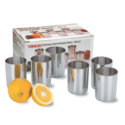 Made of Highest Quality Stainless Steel, Vinod's Amrapali Glass is dishwasher safe, easy to clean and very durable. A beautiful set of 6 glasses, it comes with shiny mirror finish.