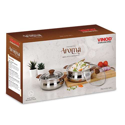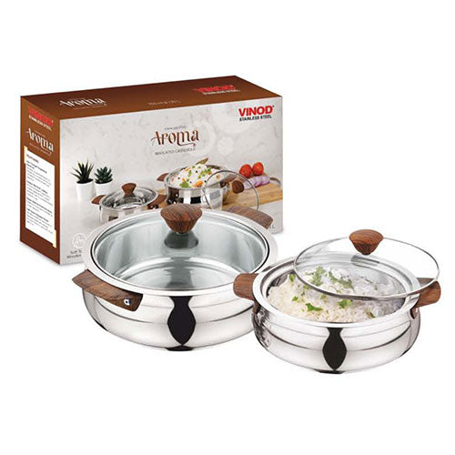VINOD’s 2 Pcs of Aroma Insulated Casserole is ideal to keep food in the state you stored, for long hours. It is made of high quality genuine stainless steel, Store hot and cold eatables alike and with it’s Glass Lid & Wooden Knob and Handles easily lift your meal and serve it in style.