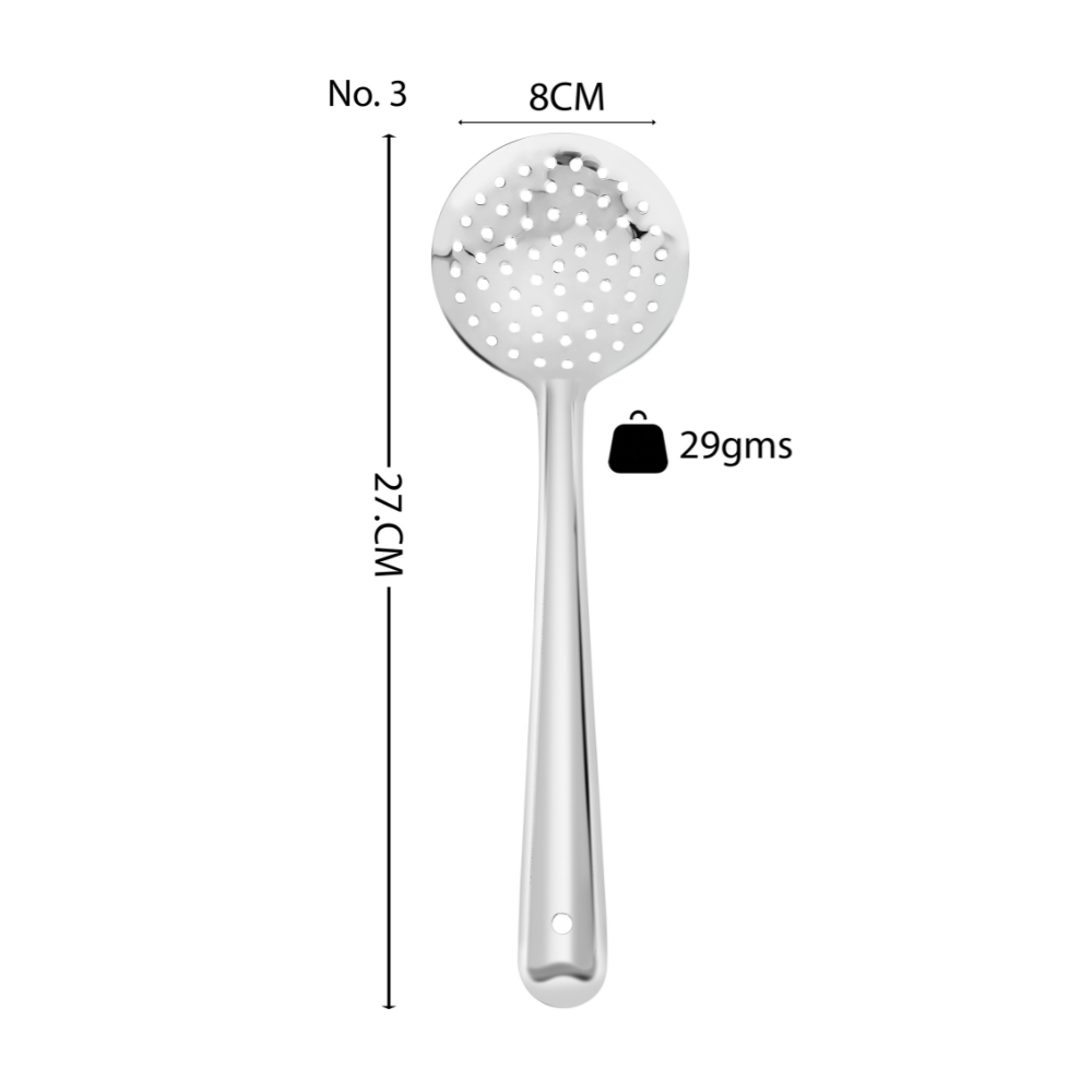 - Useful: A versatile set of 2 skimmers, perfect for skimming, straining and serving in various culinary tasks. Ideal for Puris, Pakodas, Nuggets, Fried Items, Rice and Serving.