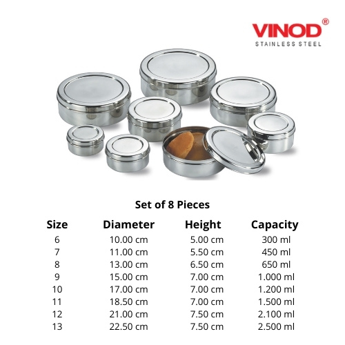 - Package Content: pack of 8 Vinod Stainless Steel puri dabba / storage container, Capacity: 300 ml, 450 ml, 650 ml, 1000 ml 1200 ml, 1500 ml, 2100 ml, & 2500 ml.