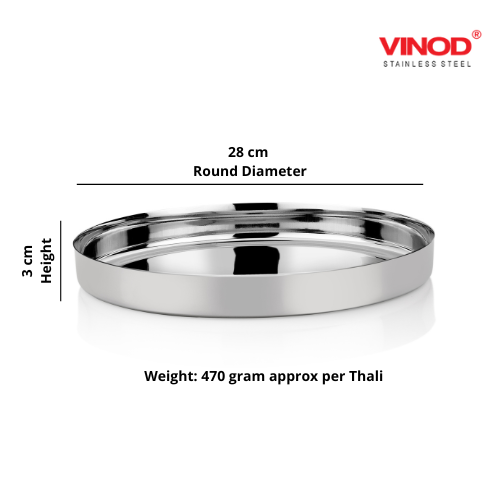 • Package Content: 2 piece of Vinod Stainless Steel Size: 28 cm: Round Dimension: 28 cm, Height 3 cm, Weight: Approx 470 gram per thali